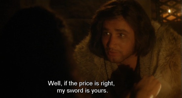 Some years later Talon returns to former Kingdom of his father but now as a grizzled veteran, a warrior and a leader of a wild pack of mercenaries. He also wears a cloak made of wolf- skin which makes him look big and muscular (things he is most certainly not- as we see later in the “grand” finale of the film). What happens next is quite confusing. The twins- rightful heirs to the Throne get attacked and a brother Mikah ends up being kidnapped by military adviser Machelli and his soldiers. Sisters seeks help and offers the only thing she can- herself to the “handsome” mercenary Talon– who as I remember should be THE TRUE HEIR to the Throne. How the hell are those too claiming the rule of the same kingdom – are they his lost lost brother and sister never menchened until now?!) – apparently not because he accepts the dangerous mission and the sex that will inevitably fallow it!