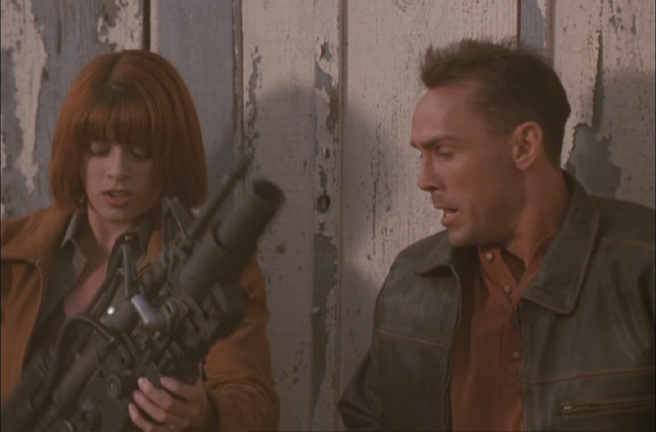 Finally Gruner and co roll straight into the town- and first things first get into the bar. As expected ugly and dirty criminals start hitting on the little redhead scientist and they pay the ultimate price as Gruner unlishes his Kung Fu skills. Interestingly the there’s a Chinese dude in there somewhere who’s sole purpose seem to be to do cool moves but get beat afterwords (common occurrence in American films for some reason).Gruner and the redhead menage to get alive out of there but some tugs fallow them and just when you thing they are doomed alien shows up and helps them (?). Then he turns from his invisible mode into the “dead friend mode”- taking the face of not too long dead Zabka. Gruner sees trough his disguise and tries fighting him but hand to hand combat doesn’t seem to be the right strategy against the aliens for some reason.