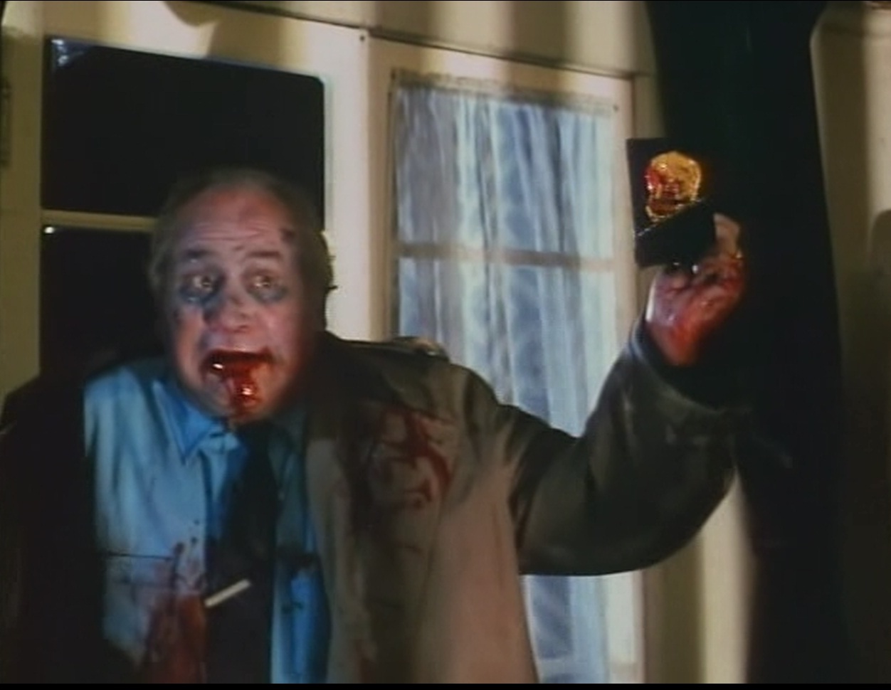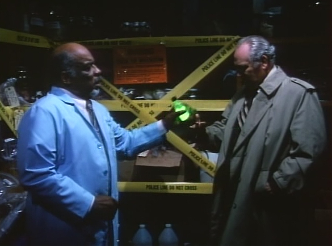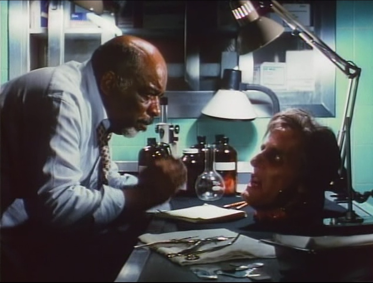 Now we are back to Miskatonic hospital. Dan is talking to Gloria (Kathleen Kinmont) who is seriously ill and is preparing for surgery. Seems that Dan has a  hot spot for her, unlike Dr West who sees her just as another body part depository. Dan noticed that, and another argue between doctors started a moment  after Gloria has been taken away. We’ll leave them discussing as we are going to pathology wing of the hospital. Dr Graves (funny name for pathologist), has  received a delivery from Lt Leslie Chapham (played by Claude Earl Jones). Dr Graves (played by Mel Stewart) is a cheerful pathologist who is in charge for the remains of the night of the massacre, and Lt Leslie delivered him the head wrapped in newspaper. The head belonged to no one else than Dr Hill.  Apparently it turned up on sidewalk in front of Arkham (so much about proper waste disposal), and, after 8 months, it’s still well preserved. Lt Leslie takes  the tour through chamber when other remains of the massacre are being held. There he had brief conversation with Dr Graves, who seems to be real nuts,  considering his black humor jokes he is making all the time. Also, besides other well preserved remains of the massacre, detective finds a green goo, which  Dr Graves jealously takes back with the explanation that he wanted to identify it first thing in the morning. The case of massacre is closed but detective  wanted to investigate a missing body parts (including the missing feet of ballet dancer). Dr Grave has only one thing to say about it – Who would like to  steal body parts? I think I got some idea.