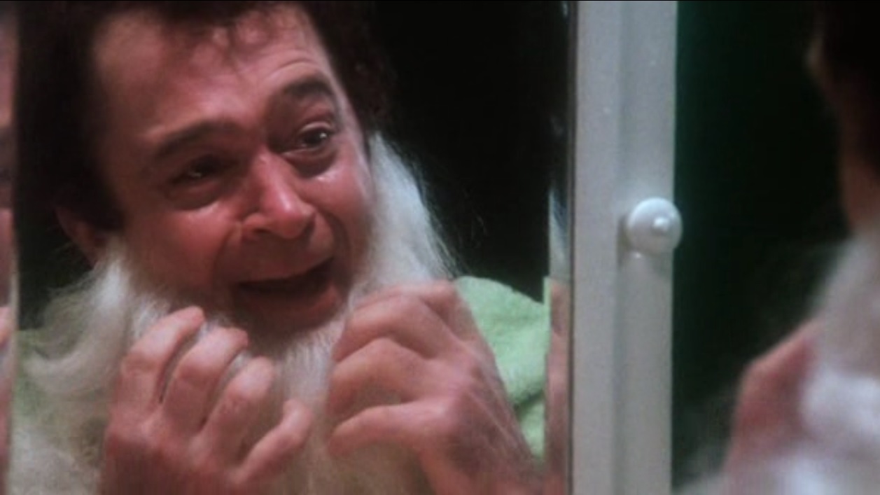 This one’s pretty straightforward so I’ll get right to it. The year is 1947. It is Christmas eve. A kid named Harry is traumatized when he sees his mom and dad getting it on whilst his dad is in full Santa garb (Santa performing oral on Mommy). Really ruined it for him. Also it doesn’t help that his brother did not believe in Santa. So Harry runs away to the attic where he intentionally cuts himself on piece of broken snow globe. I guess this is intended to represent his rebelion towards Santa. Flash forward takes us to present day (aka 1980) and adult Harry (played by Brandon Maggart) is in some middle management role at a toy company that makes Christmas toys. He’s also obsessed with Santa. Like really obsessed. Like spies on the neighborhood children and keeps a Santa-esque book of who’s naughty and nice, crazy. He even sleeps in Santa pajamas. You can sort of see where this is going.