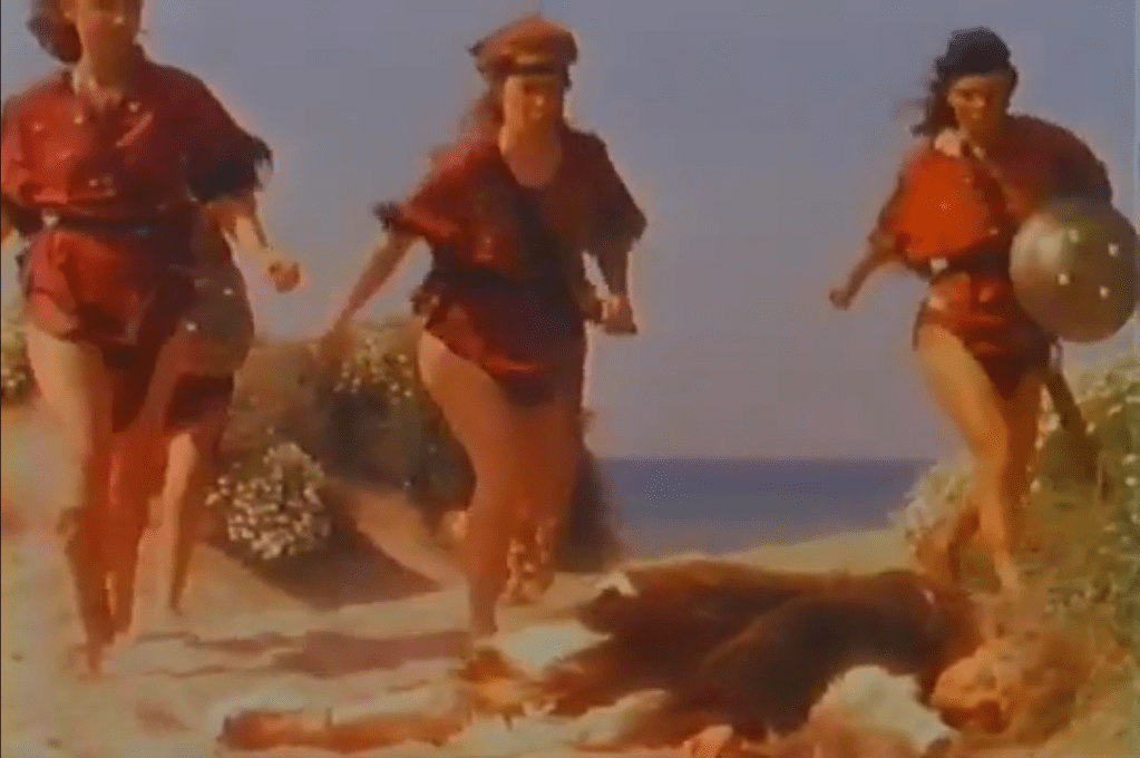 Old lady kept walking with the newborns for days it seems until she got to the ocean when she’s finally dropped dead. But the children were quickly found by a tribe of Amazons- Kuniats (who conveniently also knew the prophesy).