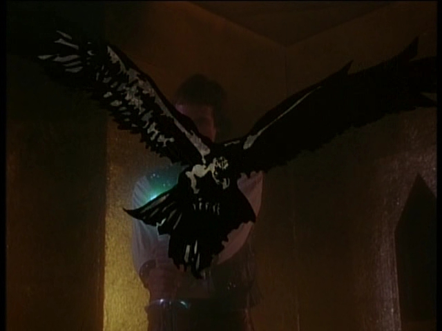 As it is often a case in such kind of movies this one also starts with “disclaimer” about story of heroic deeds and eternal struggle between Good and Evil. After that, cliches start running rampant. We see evil one-eyed Voltan (played by Jack Palance) demanding some key of some magic tower from his father (though Voltan is obviously much older than his father). Of course, this one refuses to give the key to spawn of evil so Voltan impales him with his sword and runs away. A moment later younger son Hawk (played by John Terry) arrives just in time to hear about prophecy being fulfilled and other gibberish from his dying father. Things that Voltan was looking for were right under his nose. If he aimed higher he would strike a pouch under his father’s neck. That pouch contains mind-stone which, combined with sword that hangs on the wall, creates mighty Sword of the Mind. Such sword can fall into your hand if you think about it (or run the movie backwards). Hawk takes the sword and swears vengeance upon his older brother. In that moment poorly drawn hawk flies out of Hawk’s stomach releasing a sound of a screaming woman and that’s the sign for opening credits to bust in. I would say that demented people from Chips Productions and demented director Terry Marcel have never even seen or heard hawk.