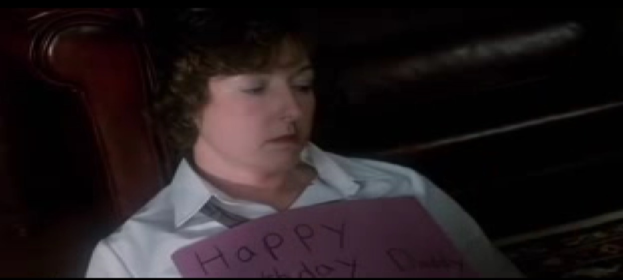 The party winds down as Joanne’s (played by Laurie Lapinski) boyfriend and his friend head off for a weekend ski trip. After the goodbyes, one of the students scheduled to help with the cleaning finds out she instead must go home for the break to be with her family. On her way out she swings by the roof to get the inventory list, but our mysterious killer has other plans. Her parents arrive, and when she becomes tied up with finding the list, her dad decides it’s best to go up and get her. He meets the killer in the stairwell, and he promptly introduces him to a nail-studded baseball bat. Then he moves onto her mom and finally onto daughter herself. The whole family have nice Christmas reunion…in death.